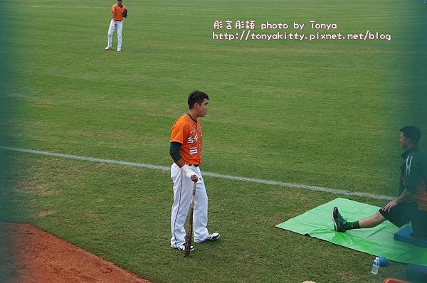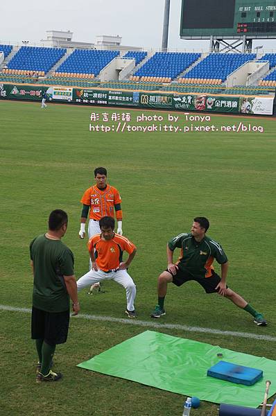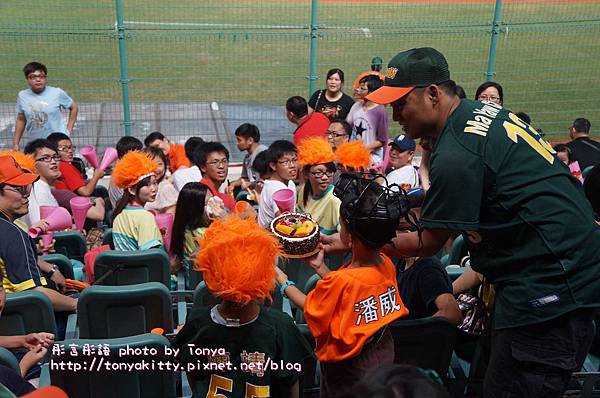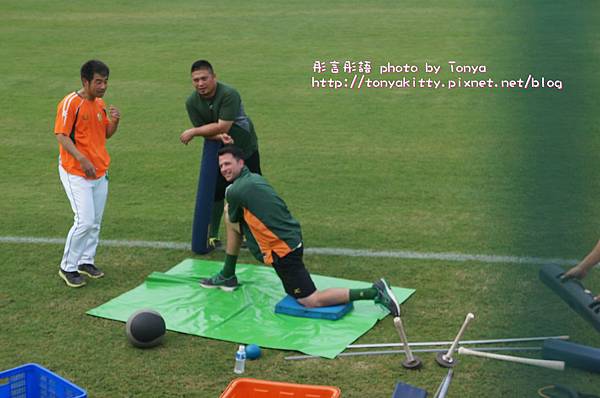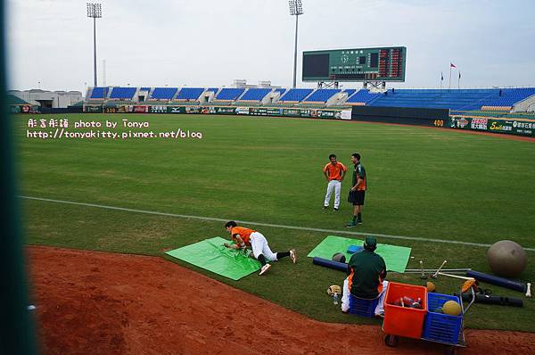 在我旁邊有外國人再跟統一獅的洋將說話(下圖),不過這個外國人是辣米糕的球迷,他說她喜歡台灣棒球,所以不管哪一隊都喜歡,外國人有戴辣米糕的帽子- -+
