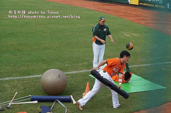 高志綱在幫先發投手羅錦龍暖身